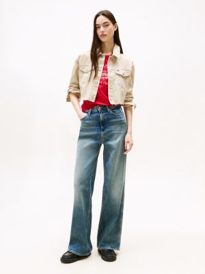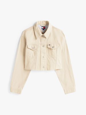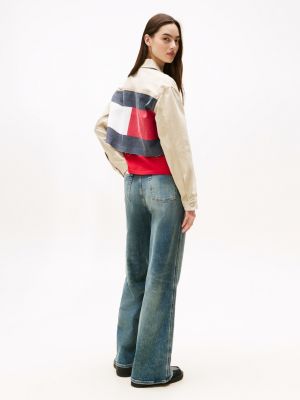 Add bold, confident branding to your look with this cropped denim jacket, accented with flag logo detailing on the back.
