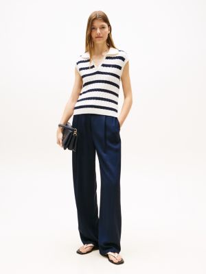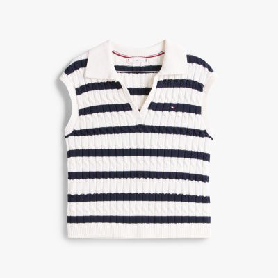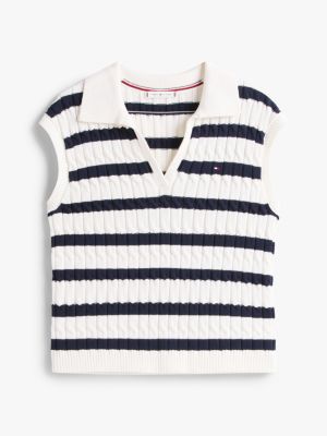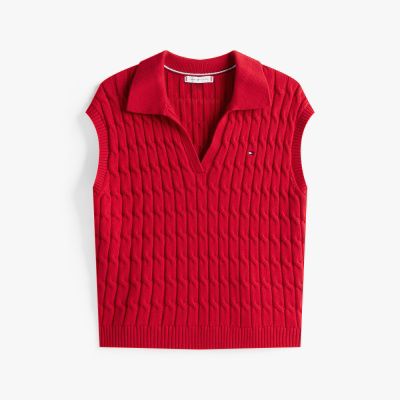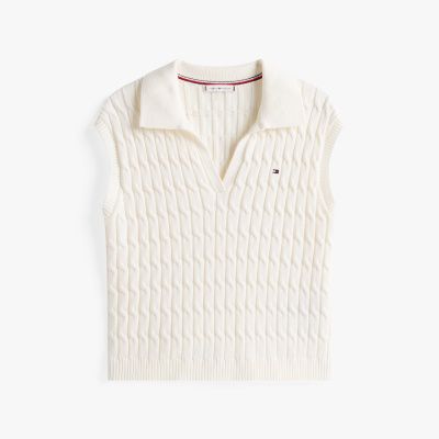 This sleeveless jumper combines a mid-weight cable-knit design with an open polo collar for a modern take on a classic.