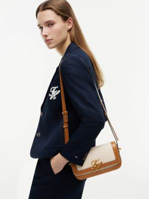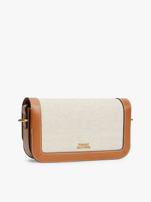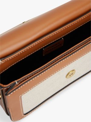 The linen-blend canvas and leather design of this crossbody bag with script logo detailing creates the ideal accessory for city strolls.