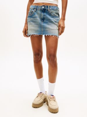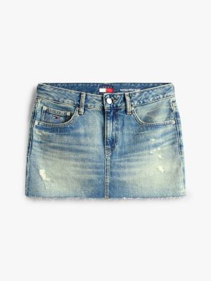 This distressed denim skirt brings a Y2K sensibility to your wardrobe, with its micro mini length and raw hemline.