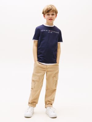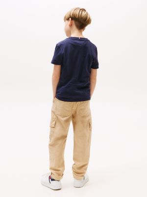 This essential tee is made from pure cotton jersey fabric for a soft handfeel, yet still gives plenty of movement for play and everyday activities. The crew neck makes it easy to pull on and pair with anything, from jeans to shorts, over lightweight vests and under chunky knitted jumpers. The standout logo across the chest lends a recognisable touch of premium style, ensuring every outfit feels elevated, even on casual days. There's a choice of four different-coloured tees for mixing and matching, each with a signature shade at its core. Tommy Hilfiger flag embroidery features on the sleeve for an authentic, branded finish.