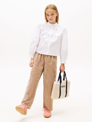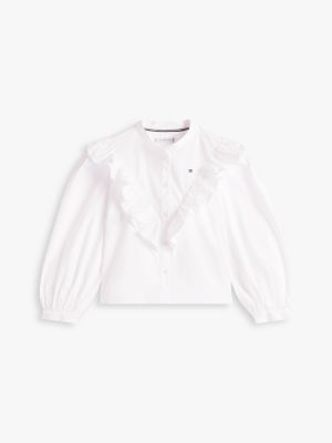 This classic poplin shirt with a smart mandarin collar features ruffle detail and balloon sleeves for a light and breezy silhouette.