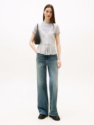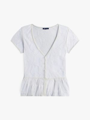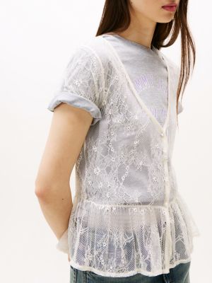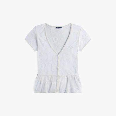 With its floral lace design and cutaway flared hem, this pretty top is perfect for creating delicate, ethereal looks.