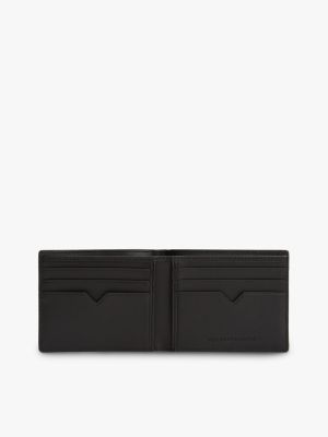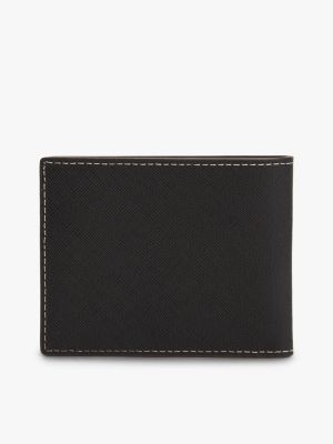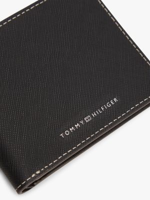 This bifold credit card wallet is crafted from premium saffiano leather, with contrast topstitching around the edge and metallic embossed branding.