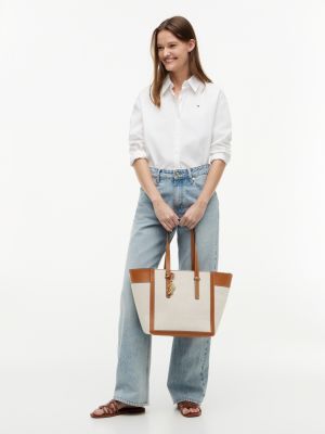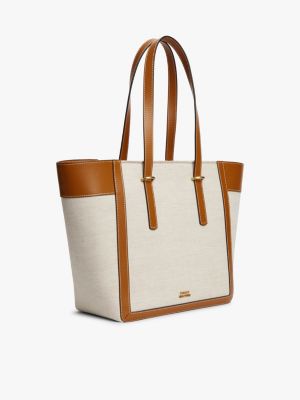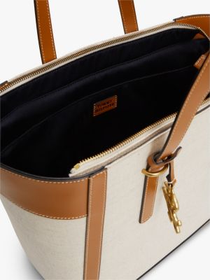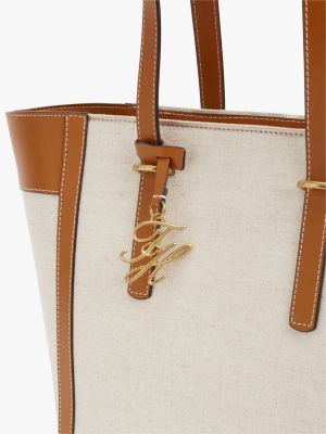 Designed in a textured woven blend, this cotton-linen canvas tote bag features a polished script logo charm and luxe leather trims.