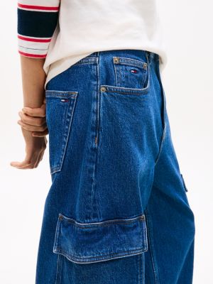 Embrace utility styling with these denim cargo jeans, cut in a loose fit with a mid-rise waist and breezy wide legs.