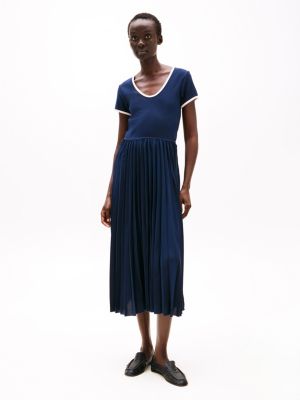 This midi dress features a flattering scoop neck and ribbed-texture bodice with an elegant pleated skirt in a contrasting smooth finish.