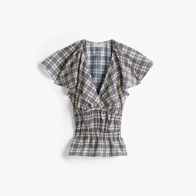 Infuse your look with a touch of romance in this charming V-neck blouse, featuring frilled sleeves, a gathered waist and ruffle hem.