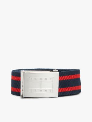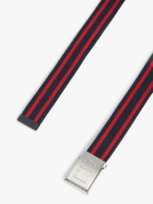 Add a touch of varsity style to your outfits with this striped webbing belt, complete with a polished plaque slide buckle.