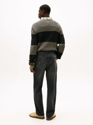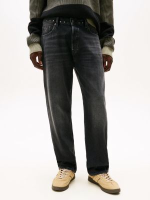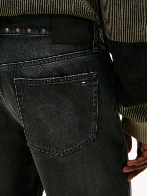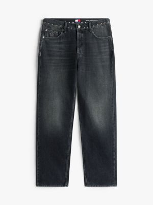 These tapered-leg jeans are an edgy addition to your wardrobe, featuring a studded waist and a black overdyed finish.