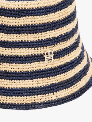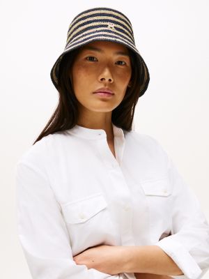 Channel beach vibes with this straw bucket hat, featuring distinctive crochet woven stripes and a signature TH monogram plaque.