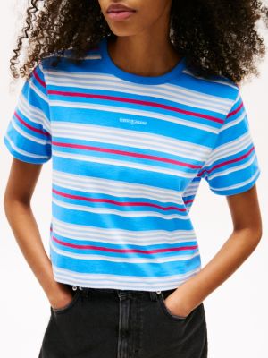 This pure cotton T-shirt features an all-over stripe design and is elevated with a serif script logo patch for an off-beat twist.