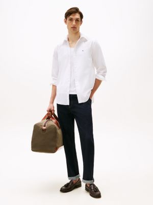 This shirt is cut from a premium peached cotton poplin fabric, combining the breathability of cotton with innovative flex technology for easy movement throughout your day. The solid-colour design offers effortless styling potential, seamlessly pairing with smart trousers, blazers or chino shorts. A rounded hem at the back adds an untucked look over denim to the list of possibilities. Signature Tommy Hilfiger flag embroidery on the chest provides a subtle nod to heritage branding, enhancing the understated aesthetic. The classic button-down collar and adjustable one-button cuffs ensure a neat, tailored appearance no matter the setting, while the regular silhouette flatters your build. All details are thoughtfully executed, affording timeless appeal and versatility from office to after-hours.