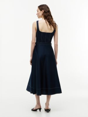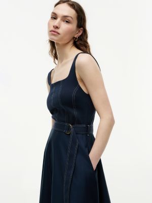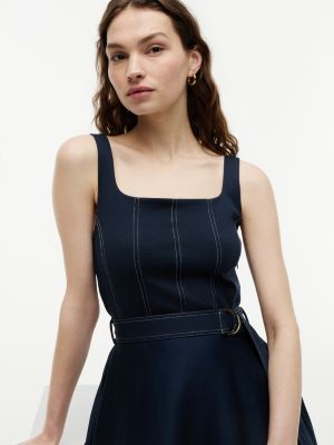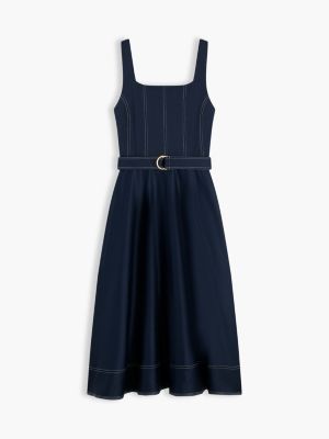Topstitch Square Neck Belted Midi Dress