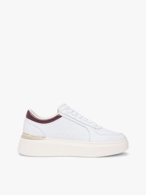 Step out in style with the latest women's trainers from Tommy Hilfiger. Discover sneakers that effortlessly combine off-duty appeal with our iconic signature style. Elevate your casual-chic ensemble by choosing platform women’s trainers, adding a fashionable edge to your outfit. Make a bold statement with the chunky trainer trend, pairing them with a logo t-shirt and high-rise jeans for a fashion-forward look. Seamlessly transition from work to play by incorporating smart heeled women's trainers into your office attire; opt for classic white women’s court trainers with tailored trousers or a midi dress for a polished yet comfortable appearance. For extra warmth, choose stylish insulated sneakers that provide both warmth and fashion flair. When summer arrives, opt for breathable, lightweight sneakers in vibrant colours to keep your style fresh and breezy. Whatever the season, keep your trainers looking spick and span with our video tutorial on how to clean your leather trainers. Embrace the signature East Coast cool and step out in style with Tommy Hilfiger's women's sneakers.